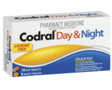 Codral contains Paracetamol which works to stop the pain messages from getting through to the brain. It also acts to reduce fever. The Codral Day & Night formula contains tablets for night time use which will help you to sleep.