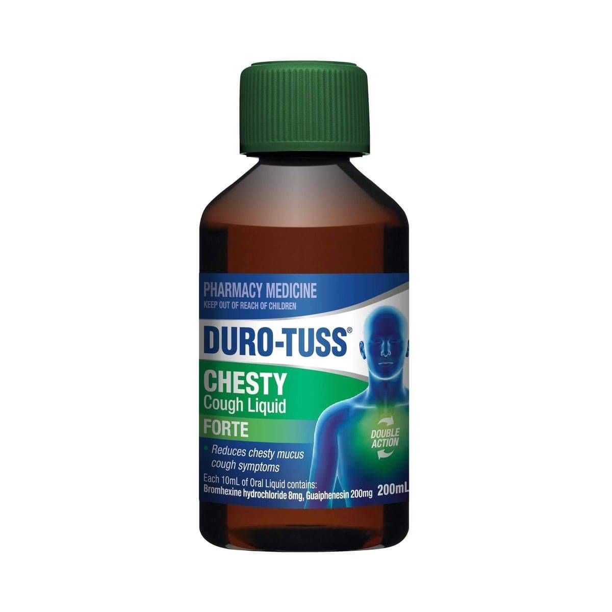 Duro-Tuss Chesty Forte Cough Liquid has a double action formula that contains two active ingredients: Bromhexine (a mucolytic) and Guaiphenesin (an expectorant) to break down and clear heavy chest congestion.